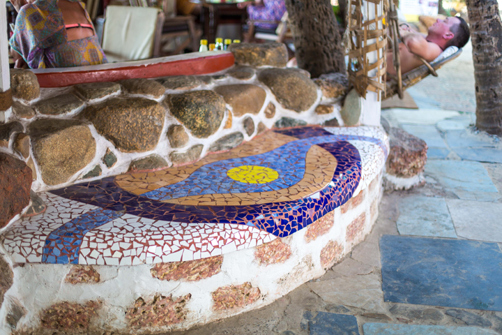 “Cozy nook has small huts without bathroom and large cottages with Bathrooms. Cozy Nook is a hippy nouveau Palolem Institution. Balconies, eating areas and the interior of some huts have been created using concrete shapes and rocks to remove dull corners and straight walls, and add colour and shape. Walls that aren’t already vibrantly tiled… Read more.. “Lonely Planet – 2006”
